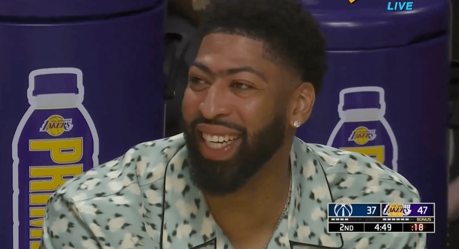 第二节比赛中,湖人主场对阵奇才,浓眉替补席露出标志性微笑。